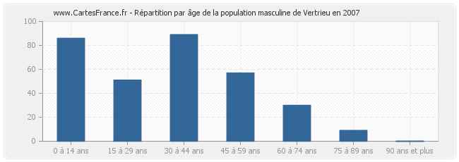 Répartition de la population masculine de Vertrieu par âge en 2007 :