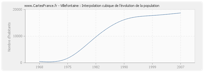Cette courbe reprend l'historique de la population de Villefontaine de 1968 à 2007 en interpolation cubique. Ceci permet d'obtenir plus précisément la population de la commune de Villefontaine les années ou aucun recensement n'a été effectué.
