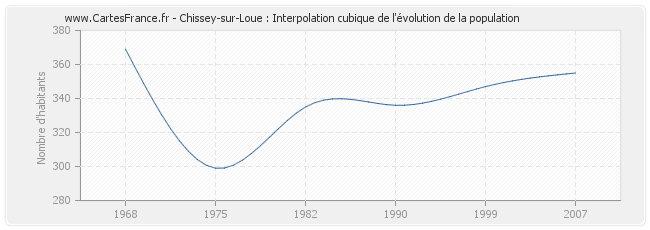 Cette courbe reprend l'historique de la population de Chissey-sur-Loue de 1968 à 2007 en interpolation cubique. Ceci permet d'obtenir plus précisément la population de la commune de Chissey-sur-Loue les années ou aucun recensement n'a été effectué.