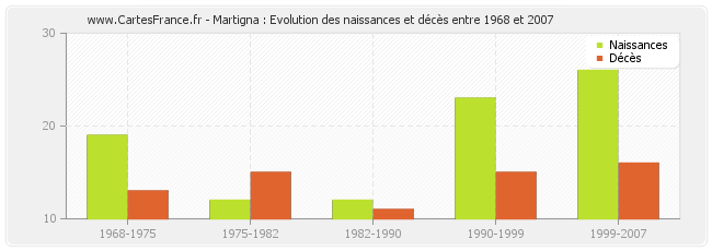 Martigna : évolution des naissances et décès de 1968 à 2007