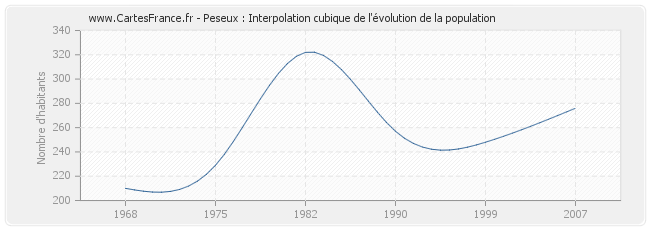 Cette courbe reprend l'historique de la population de Peseux de 1968 à 2007 en interpolation cubique. Ceci permet d'obtenir plus précisément la population de la commune de Peseux les années ou aucun recensement n'a été effectué.