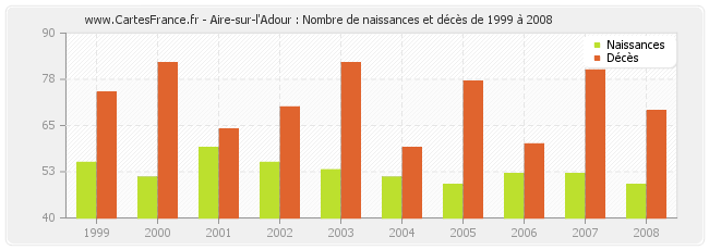 - Aire-sur-l'Adour en 2008 : 49 naissances et 69 décès