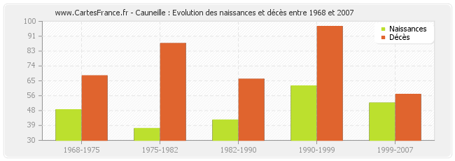 Cauneille : évolution des naissances et décès de 1968 à 2007