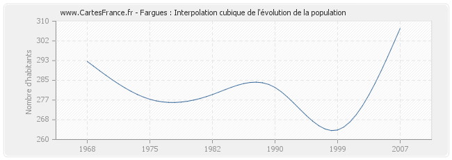 Cette courbe reprend l'historique de la population de Fargues de 1968 à 2007 en interpolation cubique. Ceci permet d'obtenir plus précisément la population de la commune de Fargues les années ou aucun recensement n'a été effectué.