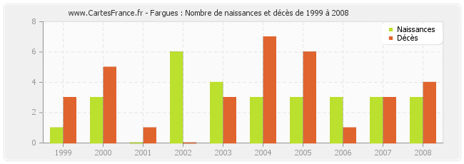 Fargues : évolution des naissances et décès de 1968 à 2007