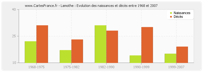 Lamothe : évolution des naissances et décès de 1968 à 2007