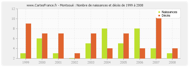 Montsoué : naissances et décès de 1999 à 2008