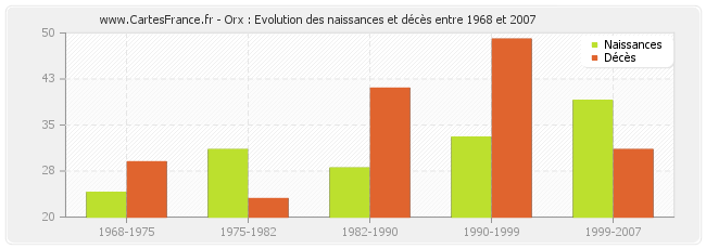 Orx : évolution des naissances et décès de 1968 à 2007