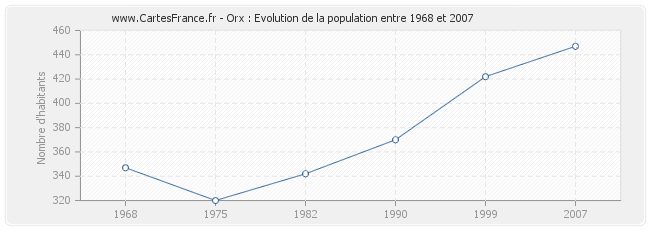 Cette courbe reprend l'historique de la population d'Orx de 1968 à 2007 en interpolation cubique. Ceci permet d'obtenir plus précisément la population de la commune d'Orx les années ou aucun recensement n'a été effectué.