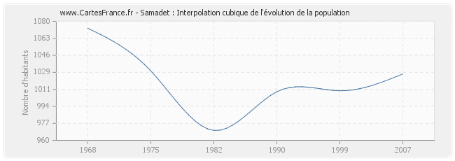 Cette courbe reprend l'historique de la population de Samadet de 1968 à 2007 en interpolation cubique. Ceci permet d'obtenir plus précisément la population de la commune de Samadet les années ou aucun recensement n'a été effectué.