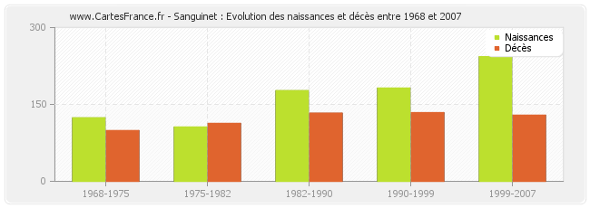 Sanguinet : évolution des naissances et décès de 1968 à 2007