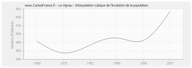 Cette courbe reprend l'historique de la population de Le Vignau de 1968 à 2007 en interpolation cubique. Ceci permet d'obtenir plus précisément la population de la commune de Le Vignau les années ou aucun recensement n'a été effectué.