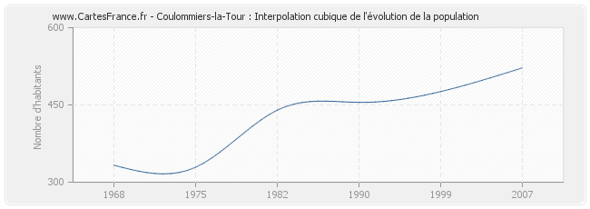 Cette courbe reprend l'historique de la population de Coulommiers-la-Tour de 1968 à 2007 en interpolation cubique. Ceci permet d'obtenir plus précisément la population de la commune de Coulommiers-la-Tour les années ou aucun recensement n'a été effectué.