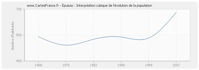 Cette courbe reprend l'historique de la population d'Épuisay de 1968 à 2007 en interpolation cubique. Ceci permet d'obtenir plus précisément la population de la commune d'Épuisay les années ou aucun recensement n'a été effectué.
