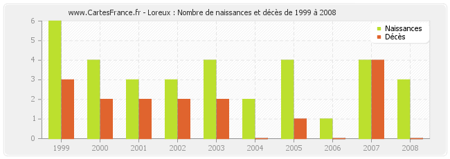Loreux : évolution des naissances et décès de 1968 à 2007
