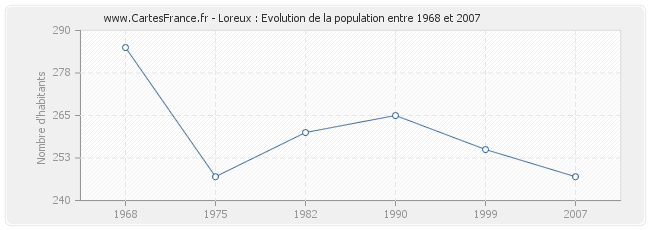 Cette courbe reprend l'historique de la population de Loreux de 1968 à 2007 en interpolation cubique. Ceci permet d'obtenir plus précisément la population de la commune de Loreux les années ou aucun recensement n'a été effectué.