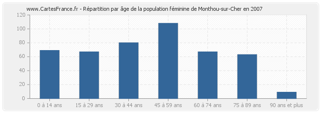Répartition de la population féminine de Monthou-sur-Cher par âge en 2007 :