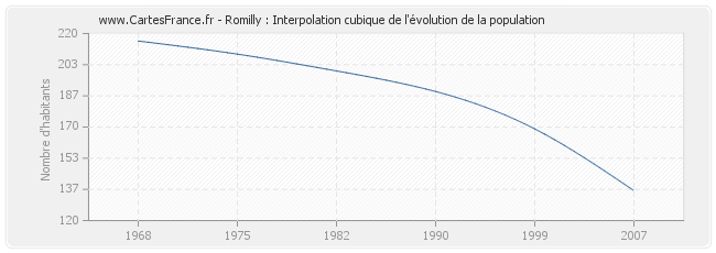 Cette courbe reprend l'historique de la population de Romilly de 1968 à 2007 en interpolation cubique. Ceci permet d'obtenir plus précisément la population de la commune de Romilly les années ou aucun recensement n'a été effectué.