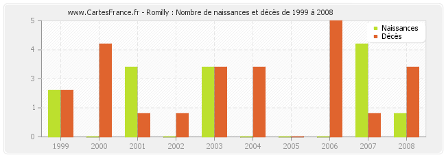 Romilly : évolution des naissances et décès de 1968 à 2007