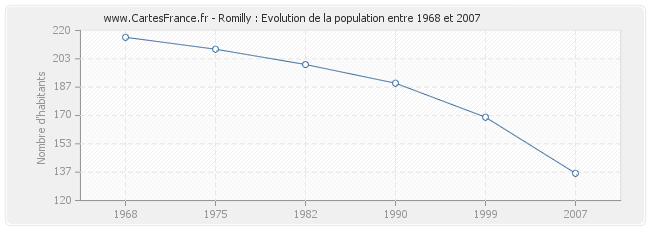 La population de Romilly était de 136 habitants en 2007, 169 habitants en 1999, 189 habitants en 1990, 200 habitants en 1982, 209 habitants en 1975 et 216 habitants en 1968.