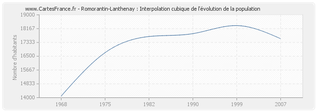 Cette courbe reprend l'historique de la population de Romorantin-Lanthenay de 1968 à 2007 en interpolation cubique. Ceci permet d'obtenir plus précisément la population de la commune de Romorantin-Lanthenay les années ou aucun recensement n'a été effectué.