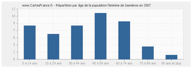 Répartition de la population féminine de Sasnières par âge en 2007 :