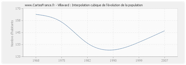 Cette courbe reprend l'historique de la population de Villavard de 1968 à 2007 en interpolation cubique. Ceci permet d'obtenir plus précisément la population de la commune de Villavard les années ou aucun recensement n'a été effectué.