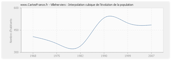 Cette courbe reprend l'historique de la population de Villeherviers de 1968 à 2007 en interpolation cubique. Ceci permet d'obtenir plus précisément la population de la commune de Villeherviers les années ou aucun recensement n'a été effectué.