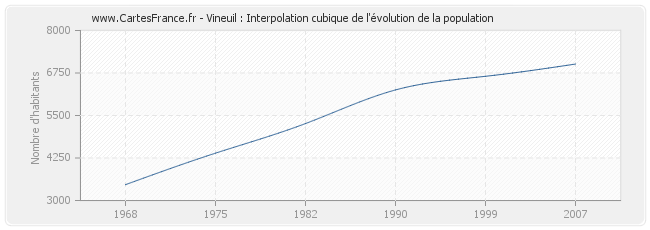 Cette courbe reprend l'historique de la population de Vineuil de 1968 à 2007 en interpolation cubique. Ceci permet d'obtenir plus précisément la population de la commune de Vineuil les années ou aucun recensement n'a été effectué.