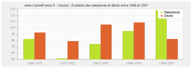 Vouzon : évolution des naissances et décès de 1968 à 2007