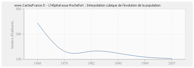 Cette courbe reprend l'historique de la population de L'Hôpital-sous-Rochefort de 1968 à 2007 en interpolation cubique. Ceci permet d'obtenir plus précisément la population de la commune de L'Hôpital-sous-Rochefort les années ou aucun recensement n'a été effectué.