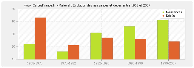 Malleval : évolution des naissances et décès de 1968 à 2007