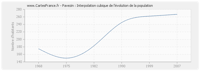 Cette courbe reprend l'historique de la population de Pavezin de 1968 à 2007 en interpolation cubique. Ceci permet d'obtenir plus précisément la population de la commune de Pavezin les années ou aucun recensement n'a été effectué.