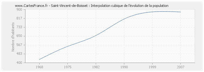 Cette courbe reprend l'historique de la population de Saint-Vincent-de-Boisset de 1968 à 2007 en interpolation cubique. Ceci permet d'obtenir plus précisément la population de la commune de Saint-Vincent-de-Boisset les années ou aucun recensement n'a été effectué.