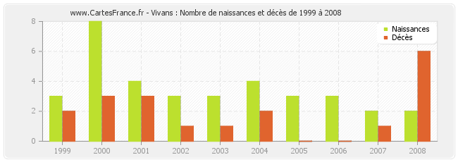Vivans : évolution des naissances et décès de 1968 à 2007
