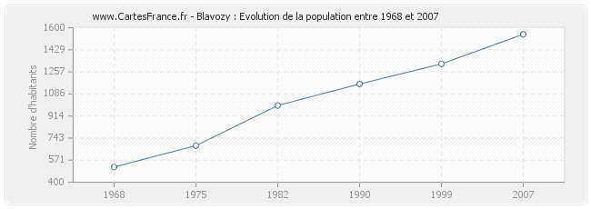 La population de Blavozy était de 1 549 habitants en 2007, 1 319 habitants en 1999, 1 163 habitants en 1990, 996 habitants en 1982, 684 habitants en 1975 et 518 habitants en 1968.
