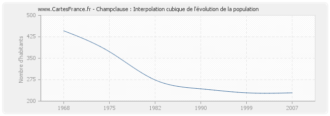 Cette courbe reprend l'historique de la population de Champclause de 1968 à 2007 en interpolation cubique. Ceci permet d'obtenir plus précisément la population de la commune de Champclause les années ou aucun recensement n'a été effectué.
