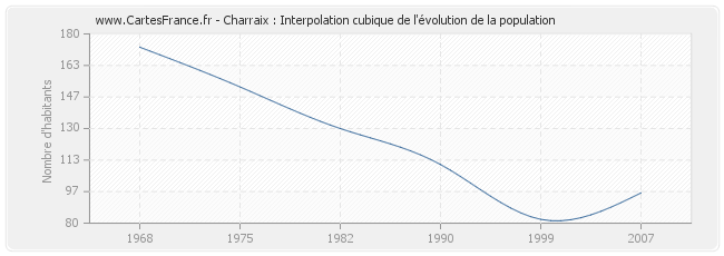 Cette courbe reprend l'historique de la population de Charraix de 1968 à 2007 en interpolation cubique. Ceci permet d'obtenir plus précisément la population de la commune de Charraix les années ou aucun recensement n'a été effectué.