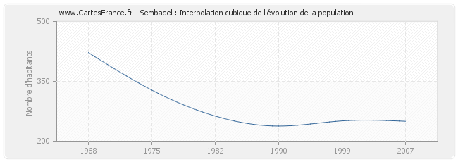 Cette courbe reprend l'historique de la population de Sembadel de 1968 à 2007 en interpolation cubique. Ceci permet d'obtenir plus précisément la population de la commune de Sembadel les années ou aucun recensement n'a été effectué.