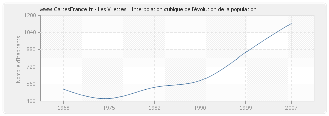 Cette courbe reprend l'historique de la population de Les Villettes de 1968 à 2007 en interpolation cubique. Ceci permet d'obtenir plus précisément la population de la commune de Les Villettes les années ou aucun recensement n'a été effectué.