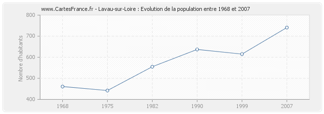 La population de Lavau-sur-Loire était de 741 habitants en 2007, 615 habitants en 1999, 637 habitants en 1990, 555 habitants en 1982, 442 habitants en 1975 et 461 habitants en 1968.