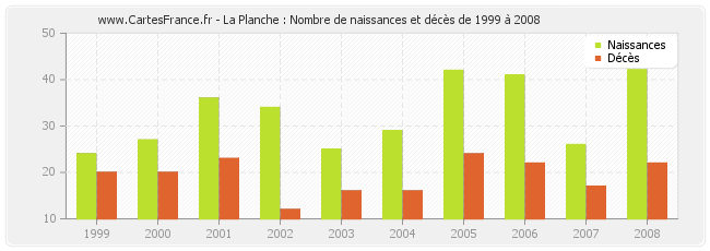 La Planche : évolution des naissances et décès de 1968 à 2007