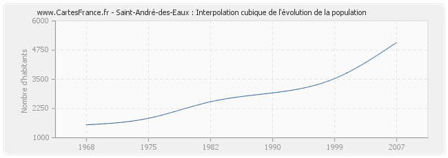 Cette courbe reprend l'historique de la population de Saint-André-des-Eaux de 1968 à 2007 en interpolation cubique. Ceci permet d'obtenir plus précisément la population de la commune de Saint-André-des-Eaux les années ou aucun recensement n'a été effectué.