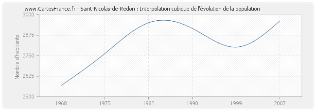 Cette courbe reprend l'historique de la population de Saint-Nicolas-de-Redon de 1968 à 2007 en interpolation cubique. Ceci permet d'obtenir plus précisément la population de la commune de Saint-Nicolas-de-Redon les années ou aucun recensement n'a été effectué.