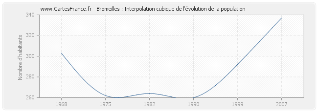 Cette courbe reprend l'historique de la population de Bromeilles de 1968 à 2007 en interpolation cubique. Ceci permet d'obtenir plus précisément la population de la commune de Bromeilles les années ou aucun recensement n'a été effectué.