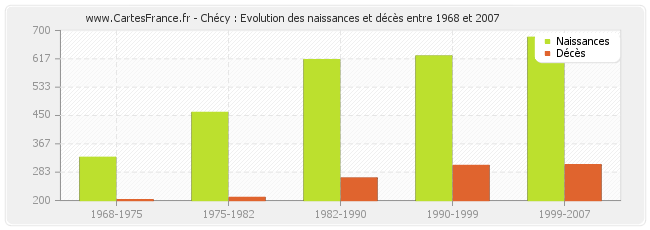 Chécy : évolution des naissances et décès de 1968 à 2007