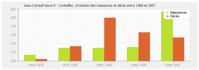 Corbeilles : évolution des naissances et décès de 1968 à 2007