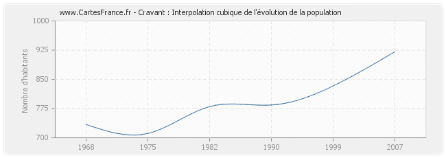 Cette courbe reprend l'historique de la population de Cravant de 1968 à 2007 en interpolation cubique. Ceci permet d'obtenir plus précisément la population de la commune de Cravant les années ou aucun recensement n'a été effectué.