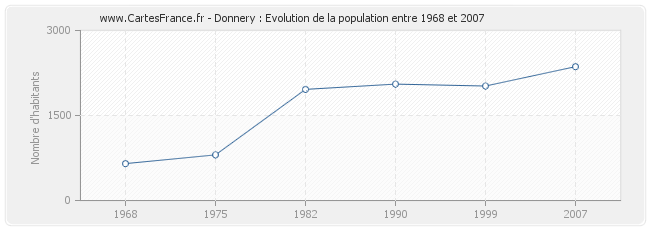 La population de Donnery était de 2 362 habitants en 2007, 2 020 habitants en 1999, 2 054 habitants en 1990, 1 961 habitants en 1982, 805 habitants en 1975 et 651 habitants en 1968.