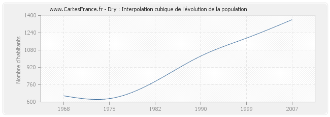 Cette courbe reprend l'historique de la population de Dry de 1968 à 2007 en interpolation cubique. Ceci permet d'obtenir plus précisément la population de la commune de Dry les années ou aucun recensement n'a été effectué.